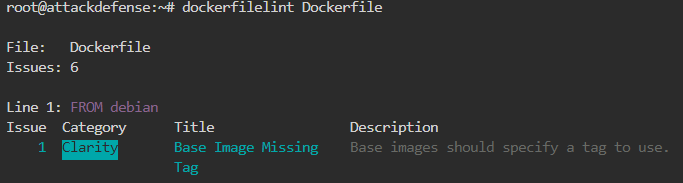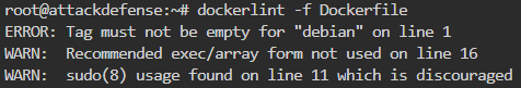 - You can use the tool https://github.com/buddy-works/dockerfile-linter to inspect your Dockerfile and find all kinds of misconfigurations. Each misconfiguration will be given an ID, you can find here https://github.com/buddy-works/dockerfile-linter/blob/master/Rules.md how to fix each of them.