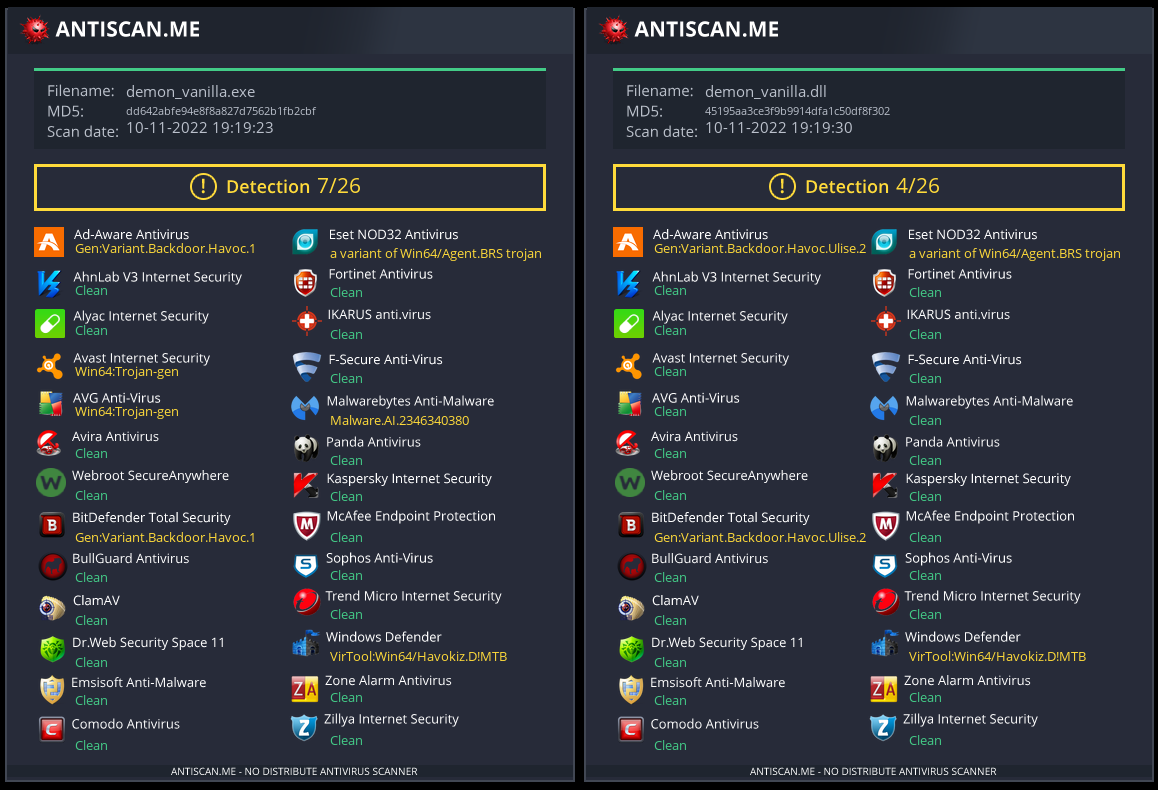 As we can see in this image, a DLL Payload from Havoc has a detection rate of 4/26 in antiscan.me, while the EXE payload has a 7/26 detection rate.